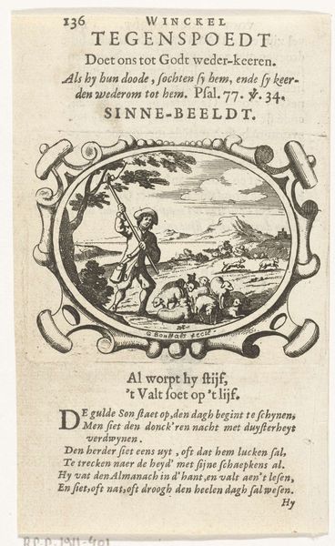 Curator: So, here we have Gaspar Bouttats' 1679 engraving, "Tegenspoed leert zuiverheid aan de ziel," which translates to "Adversity teaches purity to the soul." It's currently held at the Rijksmuseum. It's an intriguing piece that brings together elements of genre, landscape, and symbolism characteristic of the Dutch Golden Age. Editor: Hmm, my initial vibe? Quiet industry. It’s a surprisingly busy scene. But everyone is going about their work in such a composed, almost meditative way, it strikes me as strangely harmonious despite the crowded composition. Curator: That harmony, or the aspiration towards it, is precisely what Bouttats is after. The engraving is a fascinating example of how adversity, represented by the labor-intensive process of linen production, leads to a purer soul. The poem etched beneath reinforces this concept. Editor: The beaming face on the sun is a nice touch, even a little humorous against that sentiment, I think! Curator: It's a beautiful interplay of imagery and text to convey a deeper spiritual message. Consider how water and sunlight work to whiten linen. This is also what hardship does to a person’s soul. Editor: It’s like a little world encapsulated in that decorative oval. Curator: I am drawn to its depiction of a communal labor that transcends simple material production. In this era, gender roles and socioeconomic factors played a role in dictating one’s part in the economy and how experiences could affect moral standing. Editor: Agreed, it’s tempting to consider this almost like a meditation on resilience. So small, yet so profound with layers to think through. Curator: Definitely an intricate look into a complex system of social relations and symbolic meanings. Editor: Beautifully said. Let's move on to the next.