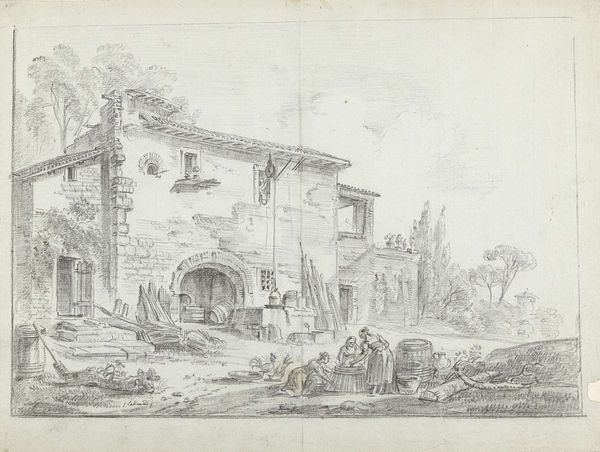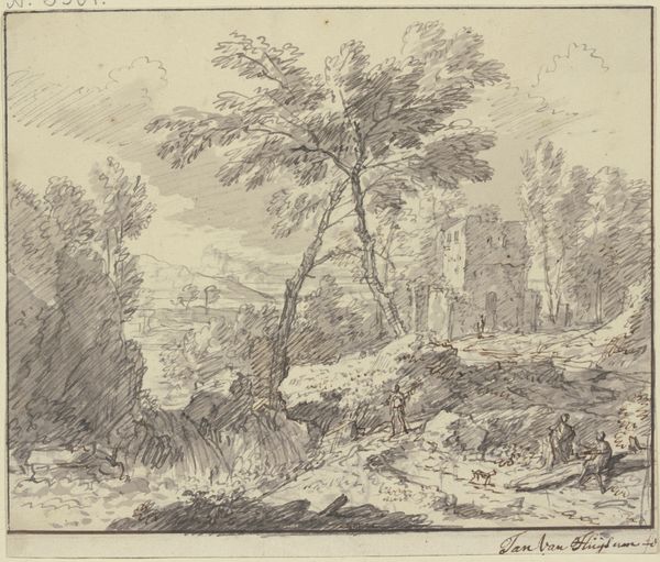 Editor: So, this is Abraham Casembroot’s "Italian Landscape with Ruins," created sometime between 1650 and 1675. It's a pen, pencil, and ink drawing on toned paper. I'm immediately struck by this sense of melancholy, like the grandeur of the past is slowly fading away. What do you see in this piece? Curator: It speaks of cycles, doesn't it? The skeletal remains of architecture, overtaken by nature, offer potent symbols. Do you see how the ruins aren't simply "fallen," but almost…absorbed? They are returning to an older order. What feelings arise when you consider that in relation to the figures in the foreground? Editor: It does give the figures a certain humility. They appear quite small in comparison to these massive ruins. Like they are almost pilgrims amongst these monuments of a lost age. Curator: Precisely. These "ruins" can symbolize lost empires, beliefs, or even personal aspirations. Casembroot reminds us of *memento mori*, echoing throughout Western culture. The overgrown landscape acts as a constant cycle, a symbolic graveyard but also a field ripe for renewal, as new stories take the place of the old. Think of what 'Italy' represented to northern Europeans at this time, a crucible of history, art, and both spiritual and temporal power. How does the medium, a sketch, impact the weight of these symbols? Editor: Good question! The sketch-like quality softens it, making it seem less overtly didactic. It's not a grand statement but a personal reflection, a fleeting moment of contemplation captured. The Italian Renaissance wasn't just about a love for classicism, but was about constant remembering and reflection on the temporality of humanity, and history. Curator: Absolutely. It’s an intimate glimpse into the artist’s engagement with enduring themes, isn’t it? Editor: Definitely. It's amazing how much meaning can be conveyed through such simple lines and shading. I never considered the relationship of medium to *memento mori* before. Curator: These visual echoes reverberate through time, shaping how we perceive ourselves and our place in the world. I'm so happy to know my Iconographic perspective offered insight today.
