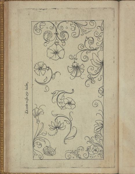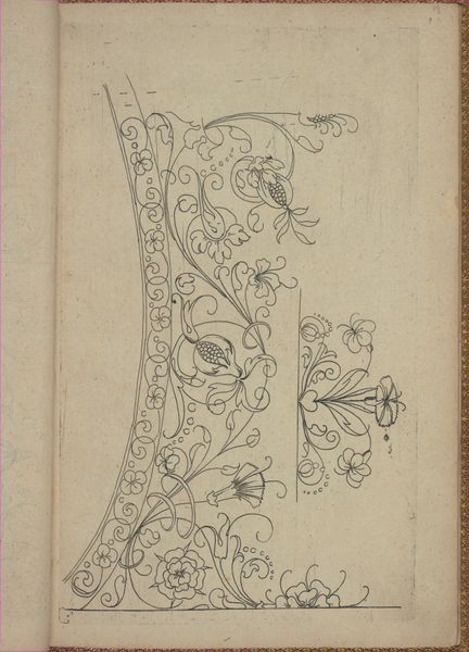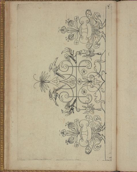 Curator: The work before us, titled "New Modelbüch (Page 20r)," comes from Andreas Bretschneider. This drawing in pen and ink on paper was created around 1615. Editor: It feels like a secret garden blueprint, sketched with such precise lines. A study in botanical motifs. The lightness, the linearity. Curator: Exactly. Model books like this served as compendiums of designs, patterns for artisans working in various media – textiles, metalwork, even architectural decoration. Think of it as a visual vocabulary of the time. The forms signal a shift in design. The geometric structures blend nature and abstraction, with stylized flowers, seed pods, and insect-like forms enclosed within circles. Editor: And those circles…they seem to serve as framing devices, or perhaps stages, for each element to play its part. The artist used an economy of line, stripping each down to its essential form. What about the border running down the right side? The patterns seem simpler there. Curator: The repetition of floral motifs in that border creates a sense of rhythm and order, containing the wilder forms to the left. I think that even something like that suggests how cultural memory functioned, selecting and reiterating certain forms to fix them. Consider the use of cartouches in the central oval shapes. It's more than just decoration, right? They act as focal points. Emblems meant for inclusion of noble arms or significant symbols for institutions perhaps. Editor: I like that. It is like how the architecture would employ such images and geometries on their doorways as if welcoming initiates. Are those crowns integrated with them too? Curator: Yes! Another possible indicator of prestige. Crowns and armorial devices appear often, demonstrating their prominence within 17th century aristocratic culture, serving much like today's symbols for fashion and music are a show of status and recognition of one's place in their community and the world. Editor: It makes one reflect on design’s role – then and now – in defining culture and identity. Curator: Precisely. It prompts me to remember how crucial such portable imagery was for sharing both artisanal knowledge, personal meaning, and collective aspiration at a time before the proliferation of the printed image. Editor: Well, I know I will have to study that for some time before the deeper connections come alive. Curator: Indeed! A beautiful reminder to find symbolic language embedded around you, guiding you to something essential that connects the current present to historical and potentially future consciousness.