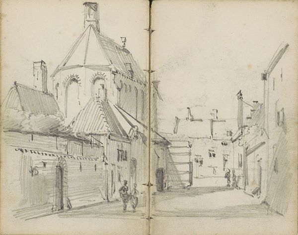 Curator: Welcome. We are looking at “Dorpsgezicht met figuren en een kerktoren,” or “Village View with Figures and a Church Tower” by Willem Koekkoek, created sometime between 1849 and 1895. It’s currently held here at the Rijksmuseum. Editor: My immediate impression is the sketch’s raw energy, even the open sketchbook format. It's intimate, like we're glimpsing the artist’s personal process. Curator: Indeed. Koekkoek was known for his idealized cityscapes, but this drawing offers something more grounded. It's a study, perhaps a preparatory work. Look at the pencil strokes, how they build the forms and capture the light. It speaks to the working methods of artists in that era. Sketchbooks were not only for planning but also important parts of the art-making production and distribution. Editor: I'm particularly drawn to the church tower dominating the composition. Churches were powerful symbols within Dutch society. By placing it prominently, Koekkoek acknowledges the social fabric of this village, especially given the economic power and moral authority churches enjoyed at that time. Curator: Exactly. While the sketch captures a realistic depiction of a village scene, we need to consider the artistic choices he’s making. Koekkoek came from a family of painters. His family had specific painting styles that became products on the market, to meet an audience demand for landscapes in a certain style. The church tower isn’t just a building; it is also representative of those dynamics. Editor: What I appreciate here is how this seemingly simple sketch reflects the intersection of art, social structures, and economics. The artist, materials, the way it represents places that shape how a piece of art will be perceived by the public… Curator: It’s fascinating to consider how the production methods and the social context intersect. Thank you. Editor: Thank you, this was insightful.