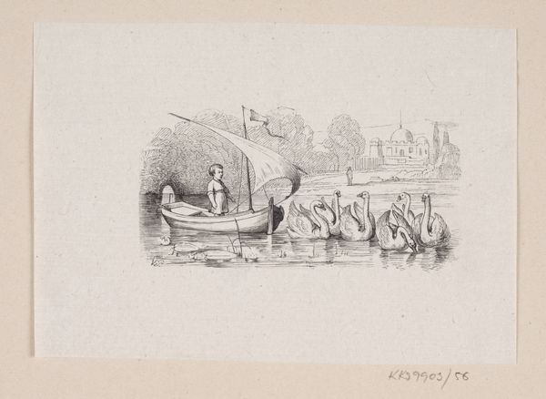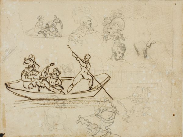 Curator: Here we have Carl Morgenstern’s drawing, "Zwei bemannte Boote auf hoher See", housed right here at the Städel Museum. What catches your eye initially about this work? Editor: Well, the urgency is palpable. It's rendered simply, in pencil on paper, but the rapid strokes convey a real sense of struggle against the elements. The way the figures are huddled in those small boats speaks to vulnerability. Curator: Absolutely. Water, symbolically, often represents the unconscious, the chaotic unknown. Putting man against it always tells a very distinct narrative. Do you read the posture of the people in the boats as resigned or actively struggling against their environment? Editor: It is hard to read their attitude fully, as their faces are not fully rendered in the piece, but their posture seems to portray a concerted effort to stay safe within a potentially catastrophic situation. Considering the context, the means of survival for these men seems so basic - pencil, paper, boat, oars, sheer will - when the forces working against them were much bigger. It’s amazing that this could communicate so much about the work to be done here to simply not sink. Curator: And Morgenstern is using a very established trope – man against nature. Note how the image resonates beyond a single boating trip to the powerlessness of people, in a group, seeking for ways to achieve safety and navigate stormy waters and stay afloat. The boats can stand in for many types of groups. And even though we are looking at a pencil sketch, you almost sense the cold spray and relentless wind, don't you think? Editor: Yes, though the artist uses simple materials here to render that environmental power, it translates beautifully to any audience through the rendering of the situation in this work. This connects to me about this image. He made these figures’ plights accessible through line work, without any further artifice. It’s immediate. Curator: It truly is. And that stark simplicity lends itself, I think, to a powerful and enduring image of humanity challenged by immense forces. Editor: Yes, indeed, something for all of us to consider given current global events. Thanks for taking the time to reveal this drawing.