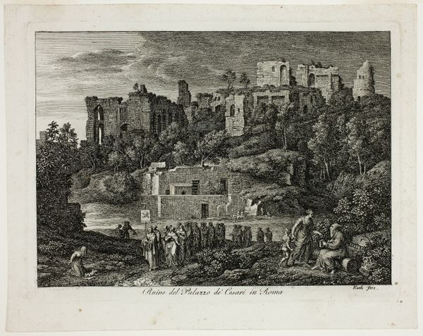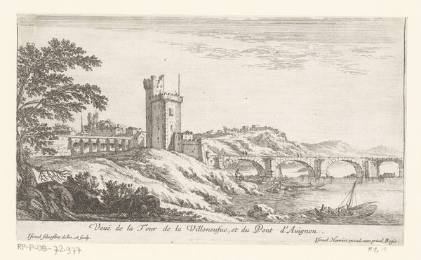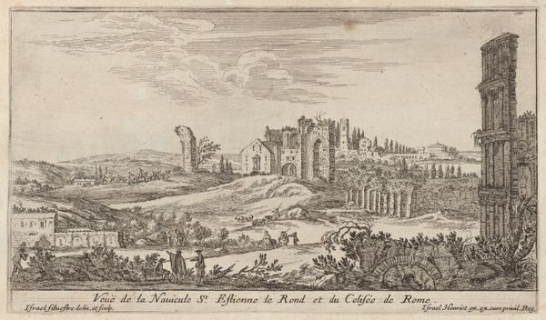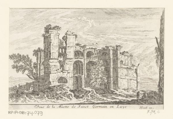 Israel Silvestre made this print, Veue de la Tour de Grignon, using etching. The composition is dominated by the stark contrast between the detailed foreground and the distant, softly rendered sky, creating a visual hierarchy. The diagonal lines of the landscape lead the eye towards the architectural structure, set atop a hill. Silvestre employs line to define form, texture, and space. The intricate network of lines creates a palpable sense of depth, drawing the viewer into the scene. The marks evoke a sense of decay. The formal language of the print invites us to consider the relationship between the built environment and its natural surroundings. Through the precise lines of the landscape, we perceive not just a physical space, but also a commentary on the passage of time and the transient nature of human endeavors.