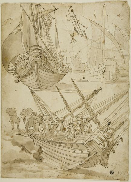 Editor: This is "The Sea Battle in the Gulf of Morbihan," a drawing by Taddeo Zuccaro from the late 16th century. It's done with pen, ink, and pencil on paper. The reddish-brown ink gives the scene a somewhat dreamlike, ancient feel. What strikes you most about this piece? Curator: The drawing immediately evokes a sense of dramatic intensity and a struggle for dominance. Notice how the ships, rendered with incredible detail, are practically overflowing with figures locked in combat. The intertwined bodies and weaponry form a complex, almost chaotic visual field. Do you get the sense that Zuccaro is deliberately crafting an allegory here? Editor: An allegory? I was mostly caught up in the action itself. What kind of symbolism might be at play? Curator: Consider the historical context. This was a period of immense naval conflict, religious strife and burgeoning empires. Sea battles, in particular, become potent symbols of power, faith, and even the struggle between civilization and chaos. Look at the intricate ornamentation of the ships – are these generic warships, or are they deliberately imbued with iconographic programs referencing specific powers or ideologies? Think about Neptune, gods of the Sea - classical iconographies. What is being brought back? Editor: So, it's not just about depicting a historical event, but also about communicating deeper ideas about power and the clash of cultures? I never thought about that... I see so much fighting. Curator: Exactly. The drawing, with its almost obsessive level of detail, becomes a repository of cultural memory. Every element, from the figureheads on the ships to the way the combatants are posed, contributes to this layered narrative. We’re invited to decode, not just observe. Does that resonate with you? Editor: Absolutely. It shifts my perspective entirely. I’m now viewing it less as a simple depiction of war, and more as a dense tapestry of symbols reflecting the anxieties and ambitions of the Renaissance period. Thank you. Curator: My pleasure. It’s always rewarding to unlock the hidden languages within these images, revealing the enduring power of symbols.