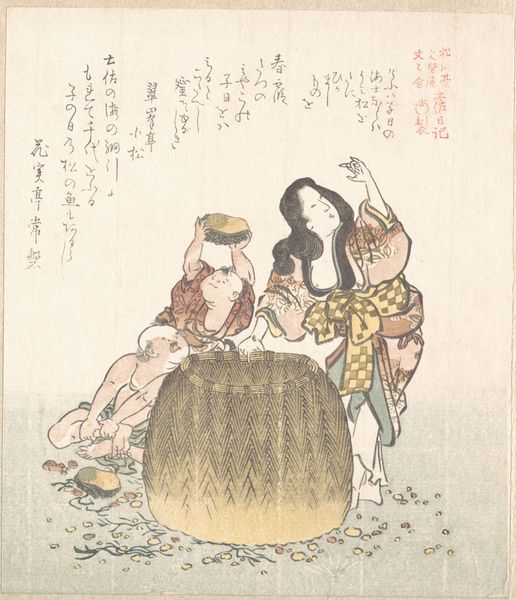 Editor: This print, "Awabi Shell Diver and Children" by Kubo Shunman, part of the Tosa Diary series, shows a woman diver and children next to a large woven basket. The text above them suggests a poem. How does this image speak to the role and representation of women within its cultural context? Curator: It's a fascinating question. The poem references the “Day of the Rat,” a day for celebrating children, but what strikes me is the portrayal of the *ama*, the diver. She’s not just a mother, she's a worker. Consider her posture, the way she is framed alongside the labor she performs. This challenges conventional depictions of women in art, doesn't it? Editor: Yes, it shifts the focus from purely domestic roles to one of economic contribution. It also prompts a discussion around class. Were these divers romanticized or was their labor recognized? Curator: Precisely. Shunman gives visibility to a segment of society often overlooked in artistic representation, opening a dialogue on gender, class, and labor. It encourages us to reconsider established narratives. Editor: That's fascinating. I hadn't thought about it that way. Curator: Art is never neutral, is it? It always reflects—and sometimes resists—the dominant social forces.
