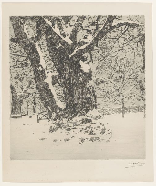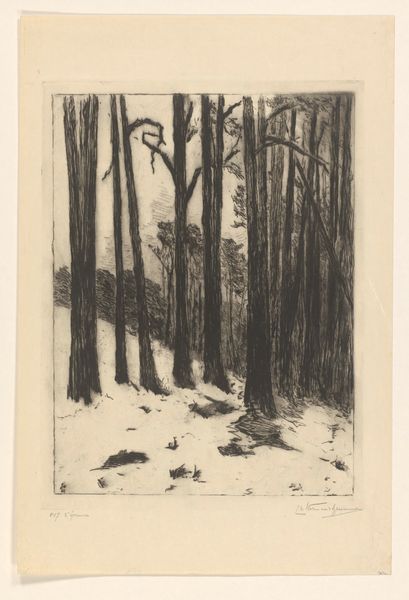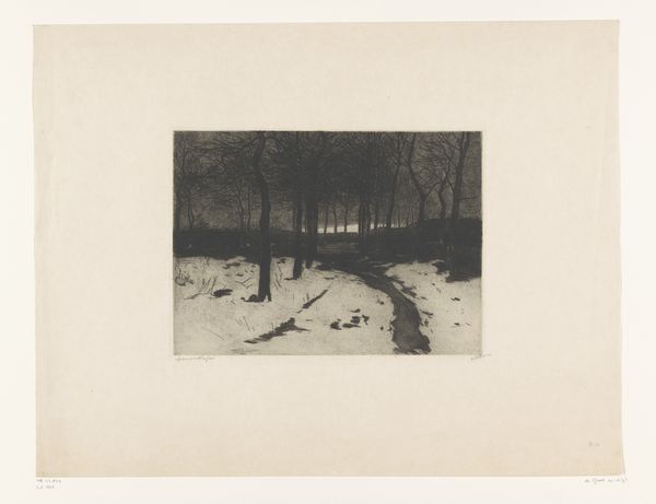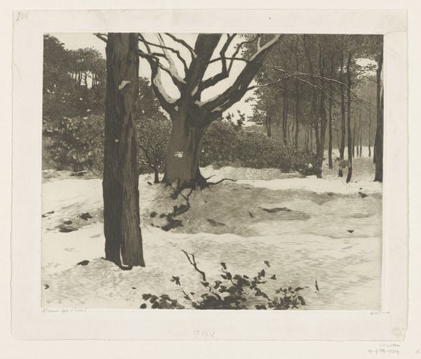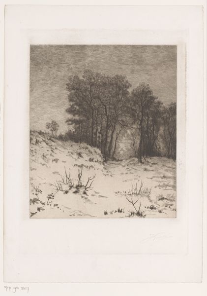 Willem Witsen made this etching of a snow-covered forest, what they call Besneeuwd bos in the Netherlands, probably sometime around the turn of the 20th century. It’s a symphony in grey, a close-valued harmony, but it’s also got this really interesting mark-making thing going on. Look at the lower trunk of that big tree, the way the lines are hatched and cross-hatched to build up the form. It’s so controlled, so deliberate, but then you see these little bursts of energy in the branches above, almost like the artist is letting loose a little. It’s this constant push and pull between order and chaos, control and freedom. And that tension, that’s what gives the print its life, its energy. The roots that reach out across the snow, they're like fingers, tentative, searching. It reminds me of some of Whistler’s nocturnes, the way he used etching to capture a mood, a feeling. It’s not just a picture of a forest, it’s a feeling of being in that forest, of breathing that cold, crisp air. That's the magic.