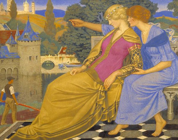 Frank Cadogan Cowper created this atmospheric painting, "Venetian Ladies Listening to a Serenade," which draws us into a nocturnal scene bathed in rich colors and textures. The arrangement of figures, with their opulent costumes and decorative setting, immediately commands attention, evoking a sense of romantic intrigue. Notice how the composition divides the space, setting up visual dynamics between the women. On one side, the figures are grouped tightly, adorned in a striking gold and black patterned gown and deep red robe. On the other, a lone woman in a blue brocade dress sits, seemingly lost in thought while brushing her hair. The artist plays with contrasts in color and form, using the women's varied poses to create narrative tensions. Cowper's strategic use of light is also crucial: it highlights the textures of the fabrics, the softness of the skin, and the architectural details, enhancing the mood of this scene. The painting invites us to consider the artifice and constructed nature of beauty and leisure. It's a world of signs and surfaces where appearances reflect deeper social and emotional realities, captured in a fleeting moment of aesthetic contemplation.