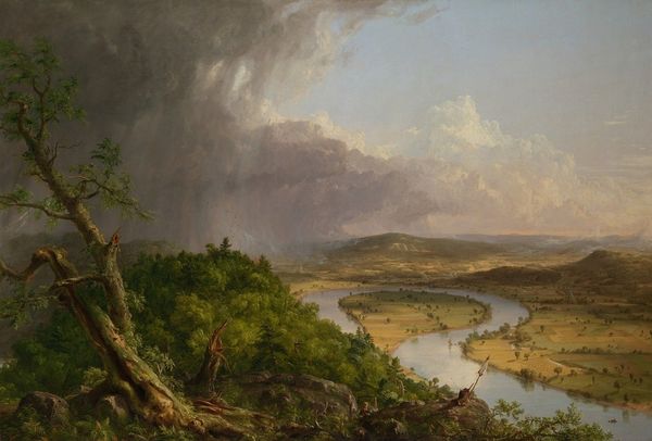 Editor: This is "View on the Schoharie" painted by Thomas Cole in 1826, an oil painting that has a lovely balance of light and dark. What do you see in this piece beyond just a landscape? Curator: I see a loaded statement about the American project at a crucial point in its development. Cole isn’t just painting a pretty picture; he’s showing us the tension between untamed wilderness and encroaching civilization, and inviting us to consider its implications for the future. Notice the almost theatrical framing of the "wild" landscape with the darkened foreground and gnarled tree. What's being framed and for whom? Editor: It's interesting you use the word "theatrical." Now that you mention it, there almost seems to be a stage, with that figure standing there observing. Do you think Cole is saying that this so-called “untamed” wilderness is being viewed through a biased, even colonial, gaze? Curator: Absolutely. The positioning of the viewer, represented by that figure, is key. They're standing at a precipice, symbolically on the edge of the known and unknown, gazing upon land ripe for resource extraction. But more importantly, it signifies the artist’s and by extension the viewer’s participation in a drama of dispossession and transformation. Consider whose perspectives are silenced in these romantic portrayals. Who is absent? Whose labor and displacement are being made invisible for this romantic vision of landscape to exist? Editor: It's kind of unsettling how the beauty masks something so complex. Curator: It's meant to be. Cole, like many artists of his time, was grappling with complicated themes of progress, ownership, and national identity. By inviting us to analyze the scene, to see beyond its immediate beauty, we start questioning the narratives of that era, and the enduring legacies of land ownership in our own. Editor: I see it now. Thank you for making me look beyond the surface and think about the story behind it.