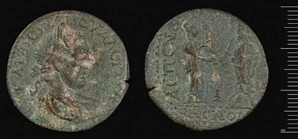 Curator: Here we have a copper coin, likely from Komana during the reign of Caracalla, dating perhaps to when he was only eight years old. Editor: It looks so worn, yet it holds the weight of an empire. What stories could this little disc tell about power and exchange? Curator: Indeed. One face displays what appears to be a temple facade. The temple is an important symbol, promising a connection to the divine order and stability. Editor: Symbols of power were often used to legitimize those in power. I wonder how effective images of temples were in quelling discontent. Curator: Consider also, the very act of minting coins declared imperial authority. The repetition of symbols forged collective identity, reinforced social hierarchies. Editor: And it reminds us that every artifact, even something as seemingly simple as a coin, is a piece of a complex, often oppressive, system. Curator: Precisely. Visual culture serves as a crucial bridge to the values of a distant world. Editor: And forces us to reflect on our present one.