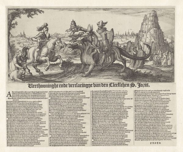 This print was made by Pieter Feddes van Harlingen, likely around 1619, and it's an early example of political satire in the Netherlands. The etching process, of course, is central to its creation and reception. An image is incised into a metal plate with acid, then the plate is inked and printed. It is a relatively efficient method for making multiple copies. The use of printmaking allowed for wide distribution of political commentary in a way that hadn't been possible before. You can see how the lines create texture and depth. The artist skillfully uses line weight and density to create a sense of drama and draw the viewer's eye to key elements of the composition. What is really clever is how it renders the text as part of the image. This print offered a form of social critique that was accessible to a broad audience, thereby fueling public discourse. It represents an important chapter in the history of visual communication and political expression.