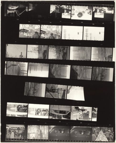 Curator: Robert Frank’s “Walker Evans' trip to Maine no number,” dated 1955, strikes me as an open invitation into a photographer’s mind. Editor: An open invitation indeed – and what a jumble! Raw edges, light leaks, subjects that are cut-off at random points in the negative strips! There is a lot here for us to digest materially. Curator: I see those contact sheets not as random or haphazard, but rather as capturing the energy of the moment; what's real is what sticks, everything else flies off! Like a jazzy free-for-all improvisation. The houses remind me of Hopper's architectural solitude; then you have interiors filled with an eerie ghostly light. Editor: Ah yes, and then there are also images of commercial transport trucks. This reminds me how mobile Frank's own work was: a roving commentary from the American road; one defined, I must say, by what goods were able to travel on them. Curator: That interplay is compelling here: a dialogue between fleeting observations and enduring structures. The mundane captured in a frame, immortalized by film, a tangible reality made ethereal through art. I feel like I am witnessing how a world filters into an artist’s imagination. Editor: Precisely. Frank turns that world, that landscape and these trucks in particular, into a raw commodity by documenting them with these processes and making them ‘art’. There is an intentional deconstruction of expectations at play here. The orange graffiti is, on that level, kind of appropriate somehow. Curator: That almost angry tagging on the film makes me wonder if, for him, it's an active way to both acknowledge and challenge the formal, maybe too reverent, history of photography! This photo acts like a rebel yell; not polished and restrained, but raw and full of feeling. Editor: Well, considering that Walker Evans made pictures documenting labor, commodities, and buildings a focus of American documentary photography and art practices alike, perhaps there is an unintentional acknowledgement by Frank on that end, as well! Curator: Yes, that might also be at work here! It's all swirling, unresolved, beautifully uncertain… and it is within those states that Robert Frank captures life itself! Editor: Well, Frank leaves us with plenty to consider indeed, and this "raw" assemblage of images invites its own fresh perspective each time you return to view it.