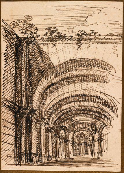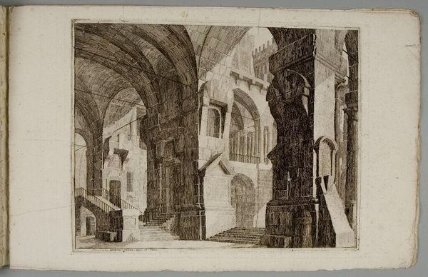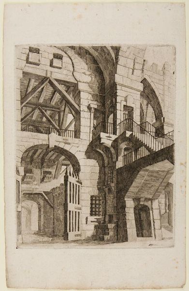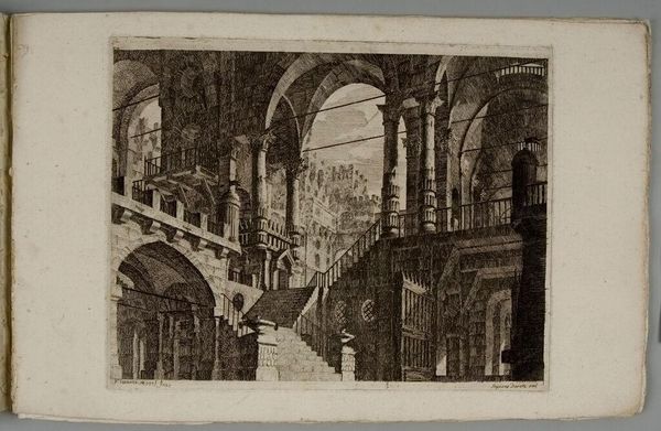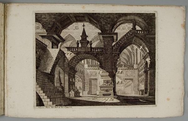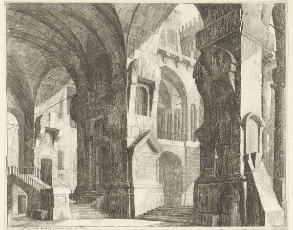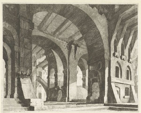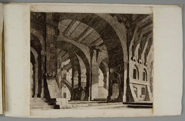 Curator: This etching, attributed to Vincenzo Mazzi, presents a "Monumental Gothic Interior with Pointed Arches and Inscribed Tablets". Its dimensions are approximately 27 by 21 centimeters. Editor: It strikes me immediately as a rather desolate space. The high arches and sharp lines seem to evoke a sense of alienation. Curator: Indeed. The dramatic perspectival recession and the use of light and shadow create a rather somber mood. But consider the architectural detail—the inscribed tablets, the repeated arches. These could reference historical or cultural power structures. Editor: Perhaps. Or could these be mere aesthetic choices, designed to create a visually compelling space? Note how the artist uses line to define form and create depth. It's less about historical narrative and more about compositional balance, wouldn't you say? Curator: I see your point. The interplay between architectural representation and compositional arrangement is certainly fascinating. It does invite us to contemplate the very nature of perception. Editor: Yes, in the end, it offers a study of line and form, a silent invitation to observe.
