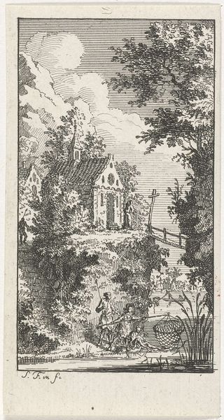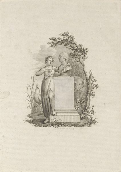 This print, "Man bij gedenkteken", was made by Simon Fokke in the 18th century. The composition is dominated by a detailed monument which rises vertically and is juxtaposed with a figure who appears to be contemplating it. Notice how the monument’s form, with its multiple panels depicting historical scenes, contrasts with the soft, organic shapes of the surrounding foliage. These panels act as visual signs, each representing a narrative element that contributes to the monument’s purpose as a historical marker. The man, rendered with fine lines and careful shading, stands as a figure of interpretation, engaging with the monument's visual language. The contrast between the monument and the man functions as a symbolic interplay between the past and the present, the monumental and the individual. Consider this not just as a representation of history, but as an ongoing dialogue with cultural memory. Art, here, serves as a structure to interpret history.