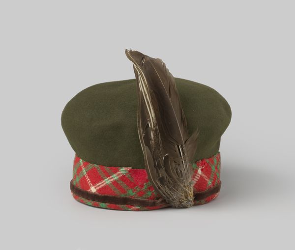 Editor: Here we have a cloche hat pin, created around 1945, location Rijksmuseum, probably mixed media and assemblage. The green is quite striking, almost a forest green. The bird caught my attention too. What story do you see here? Curator: Well, the immediate symbolism points towards status, doesn’t it? Adorning oneself with feathers, particularly those of a pheasant as we see here, speaks of a connection to nature but also to the hunt, and therefore, historically, to the landed gentry. Does this suggest an aspiration beyond the post-war reality for the wearer, or perhaps a longing for an idealized past? Editor: A longing? That's interesting. So you're saying the pheasant isn't just decorative, but… evocative? Curator: Precisely. Consider the cloche hat itself. Its shape obscures, it frames the face intimately, creating a kind of private theatre. The addition of the pheasant head and feathers becomes a powerful statement. The colors are rich and earthy. There is an obvious link here to decorative arts and art-deco esthetics too. What emotions does the pheasant evoke for you? Is it simply beauty, or something more complex? Editor: Hmm, maybe…a sort of wildness, but also a hint of… fragility? It's been captured, tamed, almost. Curator: Excellent! That tension between the wild and the domestic is central to understanding the image of the feathered object in many cultures. Its use speaks to complex relations between women, power and nature. Consider, too, the idea of metamorphosis. The wearer momentarily becomes associated with the symbolic power of the bird, but at what cost? Is there a trade-off involved in embracing these symbols of nature as a woman, perhaps? Editor: I never thought of it that way before, as a form of cultural messaging through an assemblage! Thanks for pointing out those deeper layers. Curator: My pleasure! The most mundane of objects, when viewed through the lens of symbolic history, can reveal incredible insights into the culture that produced them.