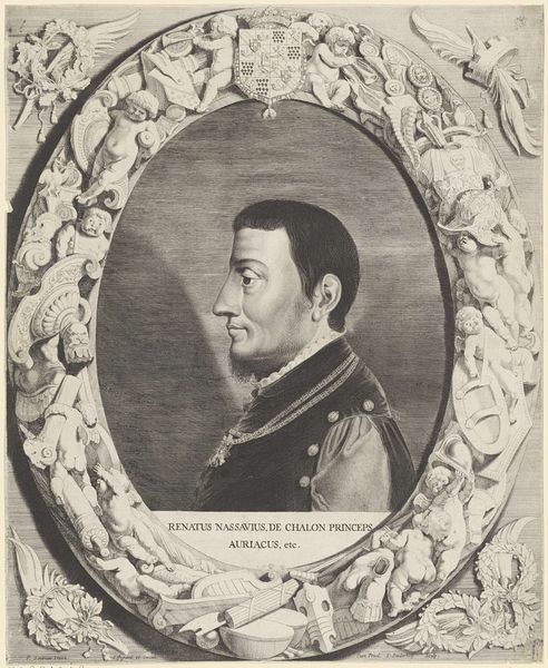 This portrait of René de Châlon, Prince of Orange, was made by Crispijn van den Queborn in the early 17th century, using engraving. This is a printmaking technique where an image is incised into a metal plate, which is then inked and pressed onto paper. Consider the labor involved in creating this image; the intense concentration and skill required to translate a likeness into a network of fine lines, cross-hatching to build up tone and volume, and precise lettering. Notice how the crisp lines and shading give shape to the Prince’s face, clothing, and even the ornate frame surrounding him. The choice of engraving as a medium is significant, as it allowed for the mass production and distribution of images. This print not only commemorates the Prince but also speaks to the rise of print culture and the increasing importance of visual representation in society. It challenges our traditional distinctions between fine art and craft, highlighting the skill, labor, and social context embedded within this seemingly simple portrait.
