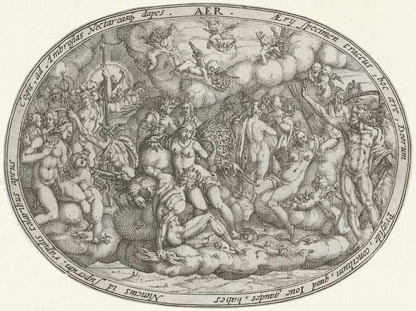 Curator: This engraving, "Triumph of Bacchus," likely created sometime between 1520 and 1562 by the enigmatic Monogrammist AC, absolutely explodes with revelry. It resides here at the Rijksmuseum, offering a window into Renaissance exuberance. What springs to mind for you? Editor: My first impression? Dionysian chaos. I see the composition brimming with figures, an ecstatic, unruly procession that's visually arresting and unsettling all at once. There’s a tension between the order this style demands and the disorder of the depicted subject matter. Curator: Indeed. Monogrammist AC captures the essence of the Bacchic festivals, those wild celebrations of wine, fertility, and ecstatic release. Look at the sheer density of interwoven bodies, how the lines themselves seem to writhe. It's almost claustrophobic! I find it so freeing, this lack of…stillness, really. Editor: And Bacchus himself, presiding on that garlanded chariot, is both god and symbol. The chariot symbolizes power, and Bacchus's associations with grapes and wine hint at both creative ecstasy and darker states of intoxication. The figures that accompany him are less celebratory, closer to distressed, overwhelmed...I suspect an allegory of darker aspects. Curator: Precisely. The artist offers us a vision that is more than a simple celebratory image, revealing deeper human and emotional complexity. These festivals did after all reflect humanity's fundamental longing to liberate itself, transcend, to find oneself through losing oneself. To engage that wild untamed side within us. Editor: The cultural memory of this image is fascinating. It reminds me of how ancient cults carried symbolic imagery over centuries—the human form, revelry, intoxication all representing the deepest psychological drives. It almost seems that it can be both frightening and reassuring for an audience. We all wish to abandon our constrains at one point or another. Curator: Right, and maybe it hints at what true catharsis should be like! Perhaps in its own peculiar way, it does provide reassurance in showcasing humanity's eternal ability to go all the way out... Editor: It's a dense engraving with layers of meaning, perfectly rendered in monochromatic intensity! The image reminds us that celebration and excess aren't purely frivolous but also integral part of how civilizations have evolved since almost their beginnings!