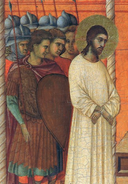 Artist: Oh, what a marvel of faith and color! Immediately, I sense an awakening here, both literally and metaphorically, the way those reds just leap out at you. Curator: Indeed. Here we have "Raising of Lazarus (Fragment)" by Duccio, a tempera on wood painting dating back to 1311. Observe how Duccio orchestrates the figures within a relatively shallow space, using color to define and separate groups. Artist: It's like witnessing a miracle unfold, isn't it? I get this powerful feeling of anticipation just by the sheer number of figures. It’s almost claustrophobic, but also electrifying! I mean look at the woman kneeling. Talk about faith, hoping he can bring someone back to life...it takes courage to be vulnerable like that. Curator: Precisely, Duccio manipulates spatial depth through subtle shifts in scale and layering. The composition draws the eye towards Christ. His hand extended in the gesture of resurrection, breaking up the scene into compositional elements. Artist: And the gazes! The way the figures surrounding Lazarus stare…it's as though time itself has stopped, and it’s like he has caught them in a dance...almost like theatre. I love how alive it all feels even after so many years. Curator: Duccio’s use of gold leaf to depict the halo around Christ’s head introduces a non-naturalistic element that directs the narrative towards an event divine. This emphasizes His role in the narrative. Artist: The rough texture too! I like how tangible it makes it all feel. All the colors give off a feeling of warmth, but if you observe closer to the right it shifts darker. It does evoke complex emotions, the joy, faith, even fear or discomfort in a divine experience like that, no? Curator: Agreed, one begins to appreciate the synthesis that Duccio establishes between Byzantine formalism, but infused it all into new found, but tentative exploration of emotional depth and naturalistic observation of mass. Artist: Seeing this work, in its fragmented state, actually feels complete to me in many ways... There's something universally moving in its simplicity and honest expression. Curator: Indeed, a potent glimpse into a pivotal moment.