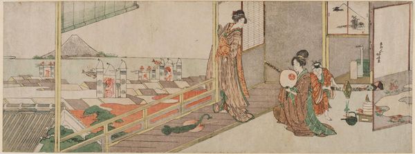 Curator: This woodblock print by Katsushika Hokusai is titled "Two Courtesans Greeting Travelers/ Shinagawa, from the series Exhaustive Illustrations of the Fifty-Three Stations of the TÅkaidÅ." Editor: There's a subtle, almost melancholic air about this image. The travelers seem weary, their forms obscured by the large yellow cloth, contrasting with the poised elegance of the courtesans. Curator: This print portrays a scene from the TÅkaidÅ road, a vital route that significantly shaped cultural and economic dynamics, influencing the imagery of travel and encounter within Japanese society. Editor: I am fascinated by the symbolic weight of the obscured faces—suggesting anonymity, perhaps, or the transient nature of encounters along the roadside. They reflect a universal experience through these travelers, mirroring our own journeys. Curator: I agree, and note how Hokusai turns the gaze onto these women and the spaces that they inhabit, revealing their roles as a constant presence. Editor: Indeed, a fascinating intersection of personal journey and societal role, skillfully captured.