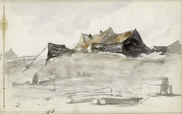 Editor: This is "Plaggenhut" by Maria Vos, likely created sometime between 1834 and 1906. It’s a pencil drawing, currently held at the Rijksmuseum. I'm struck by how raw and immediate it feels, despite the delicate medium. What stands out to you? Curator: What interests me most is how Vos engages with the everyday materiality of rural life. Consider the very process – a readily available pencil and paper used to depict a humble dwelling. It bypasses traditional hierarchies of subject matter, doesn't it? How does the artist’s choice of pencil, and the repetitive action of sketching, influence our understanding of labour, both artistic and manual, inherent in constructing this "Plaggenhut"? Editor: That's a good point; it definitely highlights the value in everyday labour. I hadn't considered how the medium itself speaks to that. So, by focusing on this common dwelling, is Vos also making a commentary on consumption and the basic human need for shelter? Curator: Precisely. This isn’t about grand estates or idealised landscapes. It's about the bare essentials of existence. The rough, sketchy lines actually emphasize the fragility and impermanence of such a structure. Does it suggest something about the lived experiences of the people who likely built and occupied this home, its reliance on local materials? Editor: It definitely gives a sense of their daily lives and perhaps the difficult circumstances. I now appreciate how her choice of subject, combined with the simple tools she used, provides such a powerful commentary. Curator: Indeed. Vos elevates the ordinary, using the simple materials at hand, offering us a glimpse into a specific place and time shaped by the hard realities of labor and material limitations. Editor: I hadn’t thought about art this way before, it opens up a new way to interpret beyond the image.