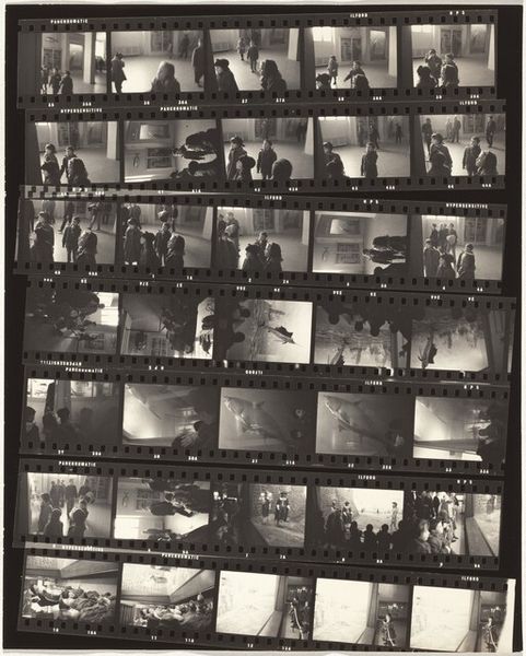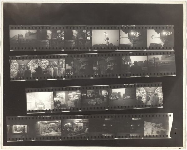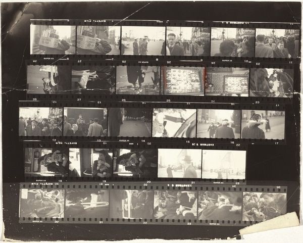 Editor: Robert Frank's contact sheet, titled "Father, mother, and cousin--Trip from Switzerland to Paris no number" made in 1949... It's really just strips of negatives pasted together. It’s interesting to see the process, like looking at an artist's sketchbook. What resonates most for you when you look at it? Curator: The strips of film act as a kind of cultural text. We see fragments, moments chosen – or discarded. Notice the way the eye moves, searching for a narrative. What stories do these images hint at, and why were these particular moments deemed important enough to capture? It feels almost like reading someone’s memories. What feelings does it evoke in you? Editor: There’s a sense of intimacy, a personal glimpse into a journey. And Paris! Even the handwritten label sparks my imagination. Is there a symbolic weight to Frank presenting his work this way, showing the raw process instead of just the final image? Curator: Absolutely. The contact sheet becomes a symbol itself – of selection, of time, of the photographer’s presence. It acknowledges the photographer’s hand, challenging the idea of a neutral, objective viewpoint. Consider how the act of arranging these strips creates its own unique composition, influencing our interpretation. Each image chosen impacts those around it; in order and in placement. Why do you think Frank didn’t want to isolate them? Editor: Maybe to show the interconnectedness of these moments, how fleeting experiences build a bigger picture of the journey? This reminds me that every image is part of a larger story, that the meaning resides within the entire visual sequence as much as the individual frame. Curator: Precisely. And in that sequence, the personal trip from Switzerland becomes a more universal symbol of cultural exploration, familial bonds, and the power of memory. Editor: I hadn’t considered the family aspect. This really gives me a lot to think about in terms of narrative. Curator: It also shows us the path to the completed photograph. Seeing these testaments to process encourages new ways of engaging with photography.