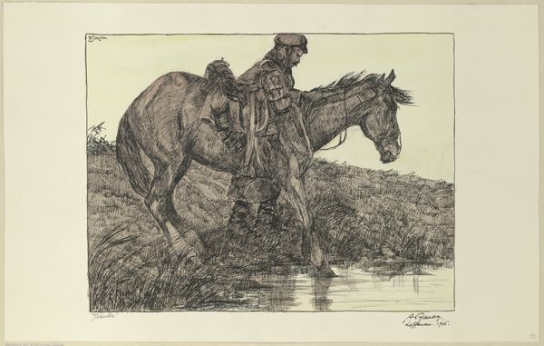 Editor: Here we have Levon West’s 1928 etching, "Indian Mother." The printmaking medium really gives it this faded, distant atmosphere. I’m immediately drawn to the texture created through the etching process and the kind of sparse landscape in the background. What do you see in this piece? Curator: The etching medium speaks volumes, doesn't it? Its accessibility compared to painting opens up questions of artistic labor. Was West consciously trying to portray Indigenous people from a "common man" perspective through this relatively democratized medium? Consider the economic realities of the time – 1928, on the cusp of the Depression. Who was the intended audience for this kind of image, produced using these specific materials and techniques? Editor: So you're suggesting the material itself shifts our understanding of the artwork, making it more about the mass consumption of art? Curator: Precisely. How does the act of making a print, intended for multiple reproductions and widespread distribution, shape our interpretation? Is it about cultural appreciation, exoticization, or even exploitation? And further, look closely at the composition: The negative space above the subjects. Was this lack intentional to make you, the viewer, ponder more about the open land and what is happening to it, and to the Indigenous People. It makes us look more critically, wouldn't you say? Editor: Absolutely, viewing it through a materialist lens really emphasizes the relationship between production, consumption, and the image's subject. I appreciate learning how the choice of medium encourages these considerations. Curator: Indeed. Considering the materials and methods helps to deconstruct the artwork. It allows us to explore art's purpose as more than just something beautiful and opens to its many relations within the culture in which it exists.