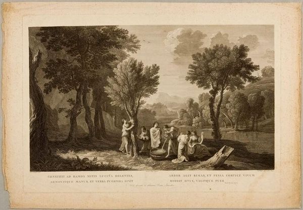 Editor: This is "March" by Francesco Bartolozzi. It gives off this whimsical, pastoral vibe. I'm curious, what do you see in this piece? Curator: It feels like a fleeting moment, doesn’t it? Bartolozzi captures the awakening of nature. Notice how the figures are immersed in simple tasks. There's a delicate balance between the detailed foreground and the softer background, a sense of depth inviting us into their world. It whispers of spring's promise. Editor: I see it now. It's more than just people in a landscape; it's about a season coming to life. Curator: Exactly! It’s a quiet celebration of renewal. I wonder, what feelings does it stir in you? Editor: Hope, definitely hope for brighter days. Thanks for pointing that out. Curator: My pleasure. Art's magic lies in those shared discoveries.