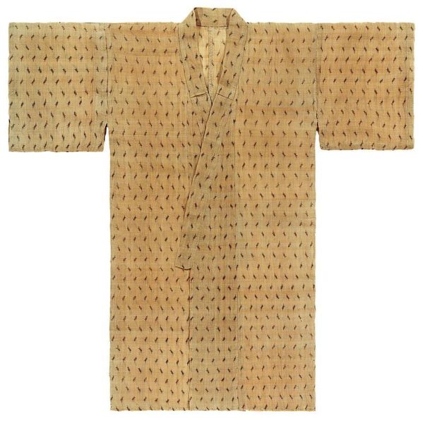 This is an anonymous yellow-ground kimono with plum pattern. Kimono, the traditional garment of Japan, is more than just clothing. It is a canvas which reflects cultural values, social status, and personal identity. Though the maker of this garment is anonymous, we can still consider the historical and cultural context of its creation. Consider how the choice of color, yellow, traditionally associated with royalty, might indicate the wearer's status. Note the plum blossoms, a motif symbolizing resilience and renewal, subtly yet powerfully woven into the fabric. The act of wearing a kimono is a performance of identity, a conscious presentation of self. Reflect on how a garment like this shapes not only the wearer's appearance, but also their comportment and sense of belonging within their community. This kimono is a testament to the enduring power of clothing to communicate complex narratives about who we are, and what we value.