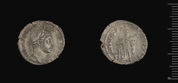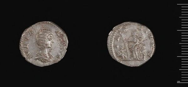 Editor: This is a Denarius of Septimius Severus, a small silver coin. It feels weighty despite its size, and the images are incredibly worn. What can you tell me about the figures depicted on this coin? Curator: These coins are powerful icons. The portrait of Septimius Severus presents not just his likeness, but also his authority, linking him to a lineage of power. Who do you think the other figure could be? Editor: I suppose a goddess? Curator: Yes. These symbols speak volumes about how rulers wished to be perceived, linking themselves to divine power and promising prosperity. The image becomes a tool of cultural memory. Editor: So it's less about the actual value of the silver, and more about communicating power. Fascinating! Curator: Precisely! A pocket-sized piece of propaganda, if you will. A lasting symbol of the emperor’s reign.