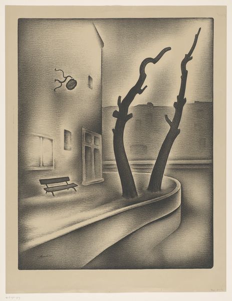Coreen Mary Spellman made this print, Telephone Poles at Krum, and it's all about stark contrasts and graphic precision. Look at how Spellman uses only black and white to create this industrial landscape. It’s like she's carving out the world with light and shadow, emphasizing the stark geometry of the scene. I love the grainy texture of the paper, it adds a sort of roughness to the image. You can almost feel the grit and the dust of the railway. Notice how Spellman plays with perspective; the telephone poles recede into the distance, creating a sense of depth, while the foreground is dominated by these bold, dark shapes. See how the light catches the edge of that building on the left? It's these small details that make the composition dynamic. It reminds me a little of Edward Hopper, but with a more graphic, almost woodcut-like feel. Spellman seems to be finding beauty in the mundane, showing us the poetry of these everyday scenes. It’s a testament to how much can be said with so little.