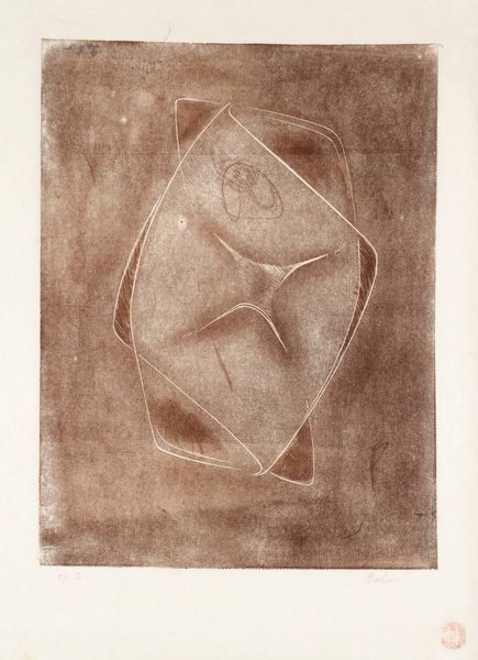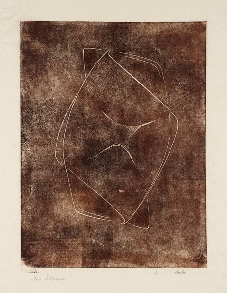 Curator: This is an untitled print by Naum Gabo, currently residing in the Tate Collections. The image measures about 20 by 15 centimeters. Editor: It feels almost like a celestial map, doesn't it? The sharp, dark triangles punctuate the softer, hazy blue like distant stars. Curator: Gabo's work is so interesting because he moved within Constructivist circles, trying to reflect modern industrial society. His move from Russia to Berlin and then London helped shape his focus. Editor: I'm drawn to the surface texture, it’s clearly a print, and you can see the marks of the process. It makes me wonder about the tools he used and the specific labor involved. Curator: The dedication "For Miriam with Love" at the bottom suggests a personal connection, which softens the often-rigid associations with Constructivism. It reminds us of the human element behind artistic creation. Editor: Absolutely. Seeing the hand of the artist, even in this abstract piece, brings it down to earth. It's not just an idea, it's an object made with intention and care. Curator: It makes me consider the art market and how such a personal piece enters into public collections. Editor: And for me, it is a great reminder to value what goes into making art beyond the finished product.