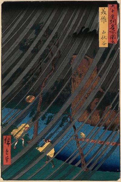 Utagawa Hiroshige created "58 (52) Sudden Shower over Shin-Ōhashi bridge and Atake" using woodblock printing techniques, a popular medium in 19th century Japan. Hiroshige lived during the Edo period when Japanese society was highly structured, with strict class divisions and limited mobility, he was born into a samurai family. This print belongs to a series titled "One Hundred Famous Views of Edo," offering us a snapshot into the rapidly growing urban center of Edo, now Tokyo. Consider the choice of depicting a sudden shower. In a society that valued harmony and order, such a moment could represent the unpredictable forces of nature disrupting daily life. The figures on the bridge, caught in the downpour, perhaps mirror the vulnerability and shared experience of people from different walks of life navigating the city. As you contemplate this image, reflect on the delicate balance between individual experience and collective identity.