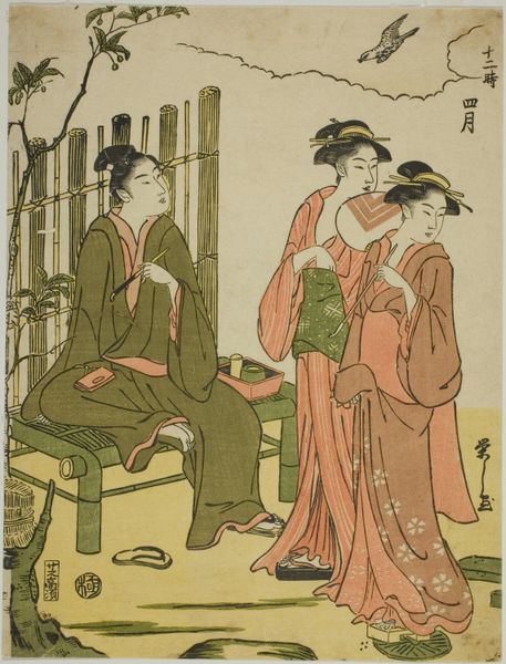 Editor: This print, “Mosquito Net,” comes from Torii Kiyonaga’s series "A Collection of Contemporary Beauties of the Pleasure Quarters," around 1784. It's currently held at the Art Institute of Chicago. It has such an intimate, quiet feel, but what stands out to me most is how Kiyonaga plays with the horizontal and vertical lines. What do you see in this piece, from a formal point of view? Curator: Indeed, the manipulation of line is key here. Note how the verticals of the mosquito net’s supports and the standing figure are starkly contrasted with the horizontality of the net’s frame. The print medium lends itself to linear precision, yet Kiyonaga uses subtle color gradations to model the forms, disrupting any sense of rigid geometry. Observe also the relationship between the flat planes of color—the green of the net, the various kimono patterns—and the implied three-dimensionality achieved through line and shadow. Where does this contrast take us? Editor: The planes and colors almost flatten the figures, while the shadowing and overlapping shapes add a spatial complexity. It makes it slightly disorienting. Curator: Precisely! There’s a deliberate tension. The composition isn’t aiming for realistic depth but something more evocative, wouldn't you agree? It's about the tension and balance created on a two-dimensional surface through careful distribution of color and line. The subdued palette, moreover, enhances the feeling of tranquility. And what do you think the function of the emptinesses might be? Editor: Perhaps the emptiness works in concert with that goal. I appreciate now how Kiyonaga uses formal elements to create a particular mood. Thanks. Curator: And I see how approaching this image solely through form and technique illuminates the artist’s deliberate construction of its visual space. The limitations and liberties of such planes makes the message so very delicate and clear.