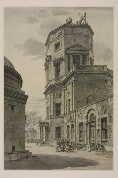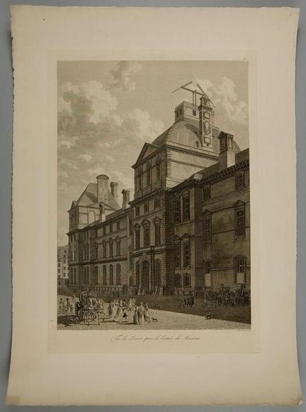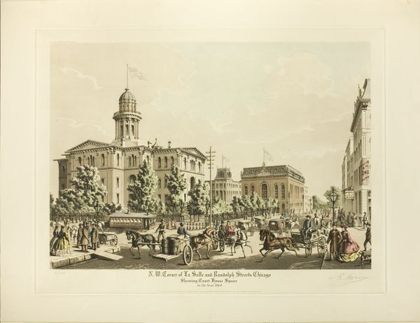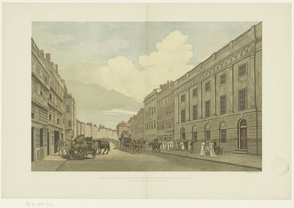 Editor: This is "Board of Trade, Whitehall, etc...from Downing Street" by Thomas Shotter Boys. I'm struck by the hustle and bustle captured. What can you tell me about the significance of this scene? Curator: Boys captured London at a pivotal time. Notice the grandeur of the architecture juxtaposed with the everyday lives of its citizens. How do you think this image was used to project an image of British power and progress? Editor: It’s almost like a stage, showcasing the empire’s heart. I guess the architecture and the people create a sense of established authority and prosperity? Curator: Precisely. Consider how the burgeoning print market disseminated such images, shaping public perception of London and, by extension, the Empire. Editor: I never thought about how an image could contribute to shaping public opinion. Thanks! Curator: Indeed. It’s fascinating to see how art intertwines with social and political currents.