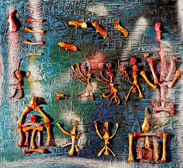 Editor: David Chethlahe Paladin's "Cave Wall Guardians," from 1972, is a striking mixed-media piece, heavily featuring acrylic. The texture almost makes you feel like you are actually staring at a cave wall. What do you see when you look at this painting, and how might we interpret its visual language in relation to its context? Curator: Considering Paladin's cultural background, Diné (Navajo) and Pueblo, it is nearly impossible not to view this as an engagement with ancestral representation. He takes the practice of Indigenous rock art and situates it within a modern framework. I ask, what happens when Paladin takes something once publicly accessible and places it in a gallery, controlled by a historically oppressive force? How does that recontextualization shift meaning? Editor: That is such a critical question; It immediately makes me reconsider how I initially received it as something static. The shift from a public ancestral site to a gallery setting undoubtedly changes how viewers engage with the work. What purpose do you think these recontextualizations serve in his broader body of work? Curator: These acts serve many purposes, the immediate is the elevation of an overlooked or dismissed culture, as seen through the Western gaze. We should also consider it to be an active means of preservation, by situating within an institution he assures the longevity of this ancestral form. But does that access then risk appropriation? It's a constant tension with work like this. Editor: These contextual layers bring even greater complexity to the already compelling visuals. I’m seeing how important it is to consider Indigenous agency when talking about Paladin’s art and the implications of the art world itself in how those are seen and understood. Thank you. Curator: It's been enlightening to reconsider the intersection between cultural preservation, artistic expression, and the sometimes fraught context of institutional display.
