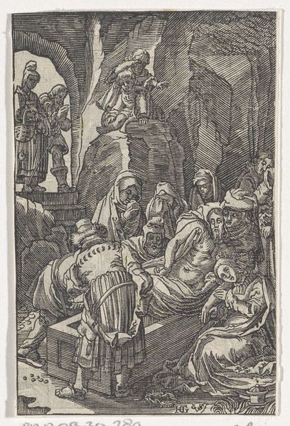 Editor: This anonymous print, "Massacre of the Innocents," is intensely dramatic. The scene is chaotic, and the figures are rendered with such raw emotion. I'm curious, what do you see in terms of how the materials and production influenced its message? Curator: The use of woodcut in its creation is essential. The medium allows for strong, graphic lines and high contrast, heightening the drama. Consider the labor involved in carving this design; the repeated impression makes it a commodity, a mass-produced image of suffering. How does this affect your understanding of its social impact? Editor: That's a great point. The fact that it was easily reproducible, meant wider distribution, and thus a greater impact on the masses. I hadn't considered that the medium itself could amplify the message so profoundly. Curator: Exactly. The materiality and production aren't separate from the meaning; they are integral to it. We must ask ourselves, how did its creation and availability shape the reception of such a violent scene?