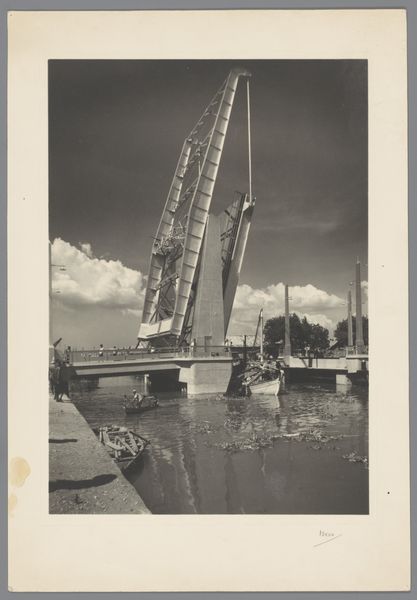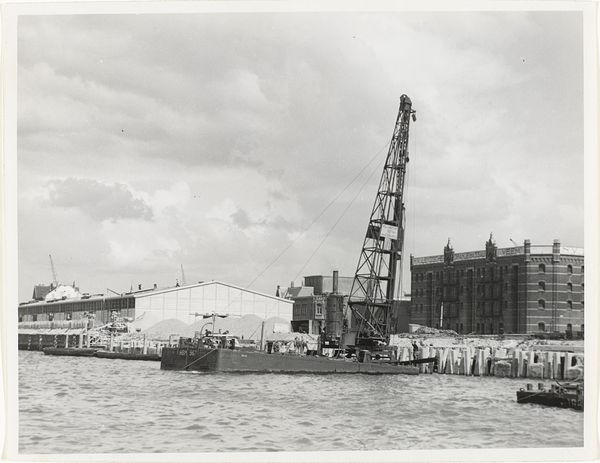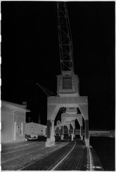 Editor: This photograph, "Untitled (cranes and construction on side of river)" by Jack Gould, gives me a stark industrial vibe. It's oddly beautiful in its geometry. What do you see in this piece? Curator: It's a curious inversion, isn't it? The negative space throws the familiar into abstraction. I see a dance between the man-made and the natural, a sort of industrial ballet, frozen in time. And the Kodak watermark, a ghost of the process itself. Does it speak to you of progress, or perhaps something else? Editor: Maybe both? Progress can be messy. Thanks, that helps me see it a little differently. Curator: Art's like that; it's a conversation, not a lecture. Now, go forth and make your own kind of beautiful mess!