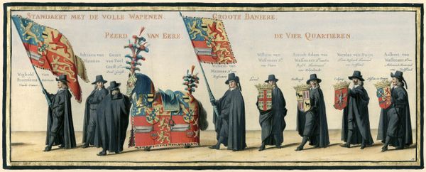 Curator: This print, “De begrafenisstoet van Frederik Hendrik (plaat nr. 19),” made between 1647 and 1651 by Pieter Nolpe, depicts part of a funeral procession. The use of engraving allows for a remarkable level of detail. What stands out to you? Editor: It feels very official, very stately. The rows of figures, the flags and coats of arms… there’s a real sense of hierarchy and order. I’m curious about what all these symbols mean, and how this image might have been used back then. How do you interpret this work? Curator: It’s vital to remember that images like this weren't merely neutral records. Consider the historical context. Frederik Hendrik was a hugely important figure in the Dutch Republic, a Stadtholder during a period of ongoing struggle for independence. This print isn't just about documenting his funeral; it's carefully constructing a narrative of power and legitimacy. What does the focus on heraldry tell you about the society it was intended for? Editor: It suggests that lineage and family history were really important. It’s almost like they’re reinforcing the Stadtholder's authority through these symbols, maybe even trying to cement the position for the future? Curator: Precisely! And how might this visual language reinforce or challenge existing power structures, and how might viewers from different social classes have perceived this carefully staged display of grief and authority? Who do you think might be missing from the image? Editor: Perhaps everyday people are missing; we see only nobility, maybe. This perspective definitely gives me a lot to consider regarding how this event was seen, and what message they intended to send. Thank you! Curator: Absolutely. And that critical lens, that understanding of whose stories are told and how, is what truly brings art history to life.