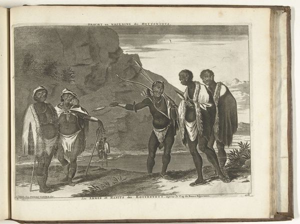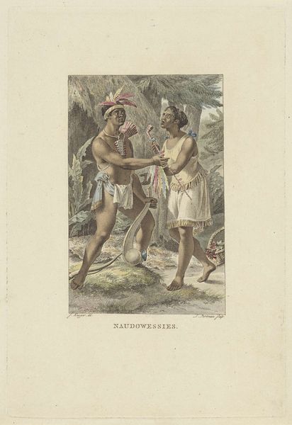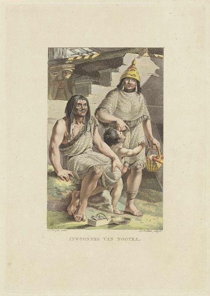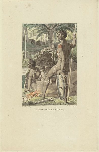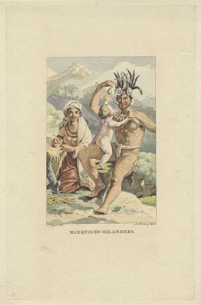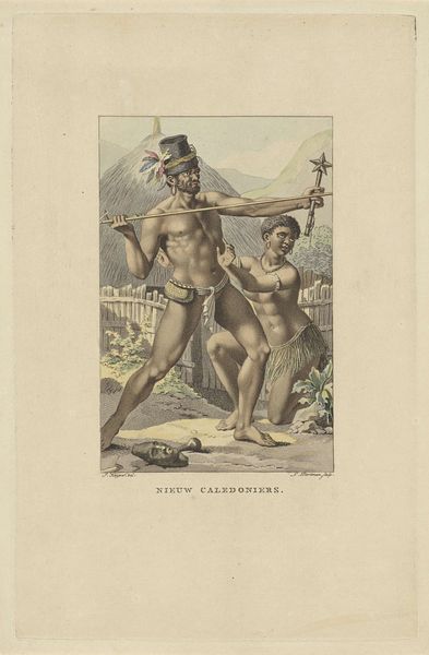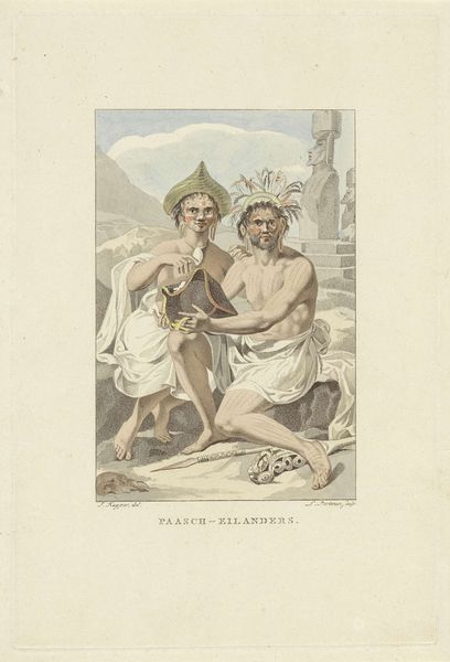 Curator: Immediately striking is this slightly mournful air of... stillness, almost. Considering the plume of smoke behind them, you might expect tension, but there's a peaceful solemnity in their postures. Editor: Absolutely. And that tranquility exists alongside this visual record from 1803 titled "Bewoners van de Nieuwe Hebriden eilanden (Vanuatu)", or "Inhabitants of the New Hebrides Islands (Vanuatu)", by Ludwig Gottlieb Portman. It's an engraving, a print—a carefully constructed image that deserves our attention. Curator: An engraving, yes, meticulously crafted… There's a dreaminess to it. That volcano looks a bit like a poorly remembered nightmare, softened around the edges. I see this idyllic South Seas scene, but through a filter of European… what? Imagination, maybe? Editor: Definitely imagination—or perhaps more pointedly, Orientalism and Romanticism. This piece very much embodies the colonial gaze of the period. We're presented with these figures who become stand-ins for an entire culture, positioned within this...staged natural backdrop. Note that man playing his flute so indifferently. Curator: Ah, the flute player! It feels performative now that you mention it. The man and woman feel like props in a tableau vivant. What a stage! A distant, erupting volcano; figures arranged like classical statuary, subtly colored with—and I can't get past this—the softness of a pastel drawing… it is kind of disturbing, in a quiet way. Editor: Precisely, and that discomfort is key. We need to ask ourselves: what is the relationship between the artist, his European audience, and these Indigenous people from Vanuatu? The artist uses engraving and portraiture not just to capture their image but to translate them into a visual language that’s palatable to a Western audience—reinforcing pre-existing biases about the “exotic other.” Curator: And reducing people to pretty images. Makes you wonder about all the stories missed. Those figures probably knew so much about their landscape, each other, the very instrument in that man's hands… details Portman wouldn’t have been aware of. A beautiful picture can still hide such painful distortions, I suppose. Editor: Indeed. These romanticized images fueled the colonial project. Analyzing these visuals reminds us to interrogate the power dynamics at play when depicting marginalized communities. Curator: It’s a reminder that art, even something seemingly tranquil, can participate in systems that are far from peaceful. It challenges me to look beyond what's immediately visible, to really question those stories, as you said, that have been erased or glossed over. Editor: Exactly. Art acts as this echo chamber. And it makes me wonder about this image and who looks at it now. Maybe our dialogue might change this old artwork’s current reception for a fraction of our audience.