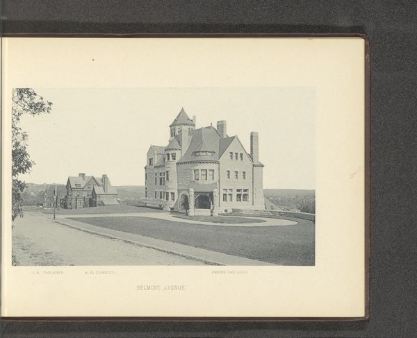 Curator: Looking at this photograph, “Gezicht op de stallen op het landgoed van George Gill Green in Woodbury,” taken before 1889, I'm immediately struck by the geometric solidity. Editor: Yes, the architecture itself feels...grounded. It exudes a sense of rootedness, doesn't it? Like a cultural touchstone in its time. You know, stables, country estates, horses—all symbolic of wealth and power. It’s all quite... archetypal. Curator: Archetypal, definitely. I see that echoed formally; observe the symmetry. The composition pulls your eye along the curving drive directly to the central carriage entry. Editor: And the monochromatic tones amplify the formal severity. Each stone meticulously placed; the play of light across the various architectural elements provides textural interest but underscores a rather...imposing feel. It evokes a sense of both security and isolation. Curator: In that era, equestrian activities signified prestige. These stables weren’t merely functional, they were a status symbol; photographic prints like this documented and perpetuated those hierarchies. What stories were these structures intended to tell? Editor: Right! It speaks volumes about the aesthetic values, the emphasis on order and proportion within the ruling class. Notice the small tower, like something from a fairy tale castle—a romanticized vision superimposed onto utilitarian space. Curator: The framing here is masterful. Although a gelatin silver print limits the tonal range, the photographer highlights significant features—carriage entrance, the circular driveway, strategic landscaping. How do all these formal aspects amplify social status and historical continuity? Editor: Ultimately, the picture creates a silent stage, devoid of human figures yet undeniably present is the implied activity of wealth—horses, carriages, servants. It gives insight into the structures and values that continue to echo within our cultural landscape even today. Curator: Indeed. Looking at how the geometry both conveys wealth, class, and status of the time, one might understand that this photographic representation reveals both history and also the enduring impact these kinds of markers have had over our shared and very recent American history.