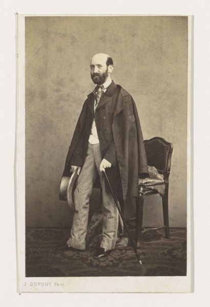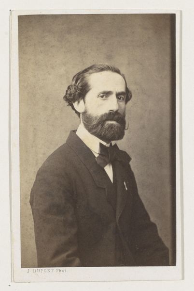 Curator: Here we have Joseph Dupont's "Portret van de schilder Bodin, halffiguur," a gelatin-silver print dating back to 1861. Editor: Oof, instantly makes me think of a Victorian novel. A serious artist caught between the world and his muse. Kind of intense, wouldn't you say? Curator: I'd say so. Photography at this time really mirrored portrait painting, lending gravitas. The Realist movement was in full swing too, which aimed to capture the truth of everyday life and its people, so portraying Bodin directly reflects that aim. Editor: The texture's something, too—it makes the guy’s beard look almost touchable. I get the urge to see the world through his eyes, almost feel what he’s feeling... a touch melodramatic, maybe? Curator: Maybe a little, but understandable. Consider the role photography had in solidifying social identities. A portrait like this broadcasted an artist’s place within cultural circles. The image itself also becomes a historical document. Editor: He seems really focused; I mean his eyes grab you instantly. Makes you wonder what he was thinking, you know? Or maybe it’s just good posing. I always struggle in photos. Curator: Photography's development introduced all sorts of concerns around capturing true likenesses and psychological states. Consider that while portrait paintings could embellish and flatter, photography was generally viewed as uncomfortably and mechanically accurate. The clothing is very precise too: a double-breasted overcoat over a carefully draped checked cloth, most probably worn in the comfort of an interior. Editor: And those hands… kind of delicate. It’s fascinating how photography captures all these little things that could easily get overlooked. Curator: It is a fine, direct study and its value extends beyond artistic considerations into questions about who got to be represented, and what purposes photographic images served at that moment in French society. Editor: Yeah, it makes you think. Seeing this picture now it connects us to someone who lived a century and a half ago. Sort of amazing how much, and how little, can change.