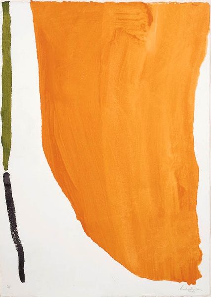 Curator: Here we have Allen Jones's "Leg-Splash" from 1971, rendered in mixed media with acrylic paint. Editor: My first thought? This is jarring. The tension between abstraction and recognizable form—that high heel—creates an unsettling visual experience. Curator: Indeed. The composition relies on this dichotomy. The aggressive brushstrokes of ochre and browns form an almost geological mass, violently disrupted by the sleek, stylized leg and shoe. The artist plays with figure-ground relationships, confusing positive and negative space. Editor: Let's consider the material itself. The textural contrast is key. Look at the roughly applied paint, almost visceral in its execution, alongside the flat, screen-printed areas of the leg. Jones seems to be deliberately highlighting the means of production. One wonders about the industrial processes that yield such polished forms juxtaposed with the artist's more direct engagement with the canvas. It really makes one question the commodification of the female form. Curator: The restricted palette heightens the formal tension. The vibrant yellow next to the neutral background emphasizes the leg's contour, pushing it forward. This careful orchestration of color, form, and line results in an unsettling but visually stimulating composition. It’s hard to look away. Editor: Absolutely. It's about power. Not just sexual power, but also the power inherent in the act of making. The work is caught between handcrafted expression and mass-produced imagery, forcing us to confront those opposing forces. Curator: A challenging piece, ultimately forcing us to question established perspectives on form, subject matter and its artistic purpose. Editor: Agreed, and Jones's use of mixed media really brings the conversation between the artistic process and material consumption to the forefront.