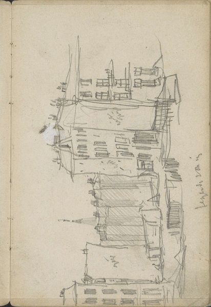 Editor: Right, next up we have “Gebouw,” a pencil drawing of a building from around 1880 to 1882 by George Hendrik Breitner. It’s at the Rijksmuseum now. It feels… tentative, almost like a memory being sketched out. What jumps out at you when you see this piece? Curator: Oh, that “tentative” feeling resonates. It's like Breitner's hand is trying to catch a fleeting impression before it vanishes! This sketch is more than just lines on paper, don’t you think? I sense a lived experience seeping through—the Amsterdam air, the clamor of the streets, condensed into this fragile rendering. See how the building isn’t really centered, or “finished?" It fades at the edges. Editor: Yes, it’s not trying to be photographically accurate at all. Curator: Exactly! Think of the Impressionists. It wasn't about capturing reality as it *is*, but as it is *felt*, right? And consider Breitner: he's not just sketching a building, he’s hinting at the ephemeral, the transient nature of the modern urban experience. What if it isn't so much about *what* he draws, but *how* he chooses to leave parts out? Editor: So the incompleteness is actually the point? I hadn’t thought of it that way. It makes me wonder what that corner of Amsterdam was like back then, almost dreamlike, like he’s letting the city itself fill in the blanks. Curator: Absolutely! We are only getting hints – breadcrumbs really. Maybe that’s all we *can* get. Anyway, it reminds us that a work doesn’t always have to show everything to say a lot. Editor: It does change how I look at sketches now. They’re not just preparatory studies, but their own unique form of expression. Thanks for that perspective.