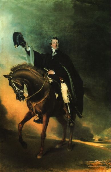 Christina Robertson painted this full-length portrait of Vladimir Orlov-Davydov using watercolor on paper, achieving an impressive scale of 230 by 147 centimeters. The composition is divided vertically, with Orlov-Davydov and his horse on the right, balanced by an architectural column and foliage on the left. Robertson skillfully uses muted tones to create depth and a sense of space. The texture is smooth, almost porcelain-like, which contrasts with the naturalistic details of the horse's coat. The way Robertson uses symmetry to balance the aristocratic figure of Orlov-Davydov with the natural world suggests a dialogue between the individual and the environment. The subtle interplay between the vertical lines of the figure and the curved lines of the landscape elements introduces a dynamic tension. It prompts us to consider how identity is both shaped by and exists in harmony with its surroundings. The painting invites contemplation on the intersections of social status, personal identity, and the aesthetic ideals of its time.