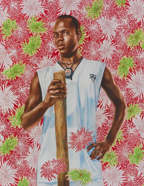 Editor: So, this is Kehinde Wiley's "John Churchill Duke of Marlborough" from 2012, it’s an acrylic on canvas. What I find striking is how Wiley combines a classic portrait style with that vibrant, almost overwhelming, patterned background. What do you see in this piece? Curator: Wiley, in this dazzling remix of art history, uses portraiture as a powerful tool to disrupt conventional power structures. The "Duke of Marlborough" initially evokes a tradition of European aristocratic portraiture. However, by placing a contemporary Black man at the center and surrounding him with an African wax print pattern, Wiley reclaims and redefines notions of power and representation. Editor: So it's about challenging who gets to be seen, who is worthy of being memorialized in this grand, historical style? Curator: Precisely. He's questioning the historical absence and marginalization of Black figures within Western art. Furthermore, think about the symbolism inherent in the African fabric—it speaks to identity, diaspora, and the complexities of cultural hybridity. It encourages viewers to confront the racial and social politics embedded within art history. Editor: I see the wax print pattern sort of enveloping him, as if asserting his presence in this space. It really makes you rethink those old portraits in museums. Curator: Absolutely, Wiley invites us to consider how identity, race, and power intersect and how art can serve as a vehicle for social commentary. The work prompts questions of visibility, agency, and historical narrative, doesn't it? Editor: Definitely! I never thought about portraiture as such a loaded genre before. Thanks for making me look at it with new eyes! Curator: My pleasure. It's in these dialogues that art reveals its power to challenge and transform our understanding of the world.