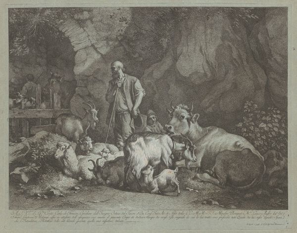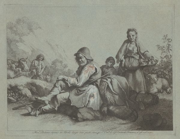 Editor: This is Francesco Londonio's etching, "Sleeping Shepherd Boy and Woman with a Child," created sometime between 1759 and 1782. The figures seem suspended, perhaps caught between waking and sleeping. How do you interpret this work through the lens of its composition and technique? Curator: Notice how Londonio manipulates the etched line to create a clear division of space. The figures are set against a complex landscape that acts more as a stage. Observe the woman standing on the left: Her vertical posture creates a stable column to counterbalance the diagonally reclining shepherd boy. What does this juxtaposition suggest to you about the artist's intentions in guiding the eye through distinct forms and textures, to suggest depth? Editor: So, rather than a natural scene, you are suggesting a very deliberate arrangement? I hadn't considered the contrast between vertical and horizontal lines. Curator: Precisely! And how Londonio renders texture contributes to the drama. Look closely at the velvety blacks and the rough hatching that delineate different planes, foreground from background, figure from earth. Consider the implications of this controlled manipulation of dark and light – what mood is thus achieved? Editor: The careful tonal gradations create a soft, almost dreamlike quality. It feels less about realism and more about the formal relationship between the figures and landscape, with contrasting forms and textures playing the most significant role in my appreciation. Curator: Indeed. And the limited tonal range reinforces this by flattening the pictorial space to concentrate on pattern and form within defined areas of visual contrast. These self-contained structural arrangements contribute more than the thematic, creating overall aesthetic affect and purpose. Editor: Thanks! I am rethinking how much focus I previously placed on thematic elements.