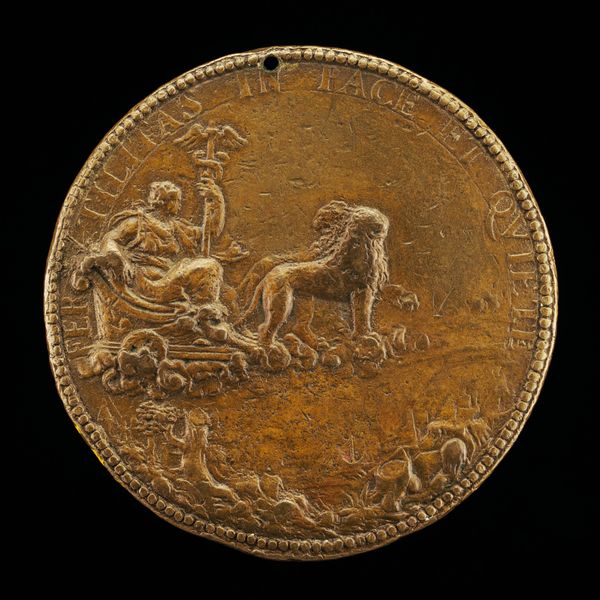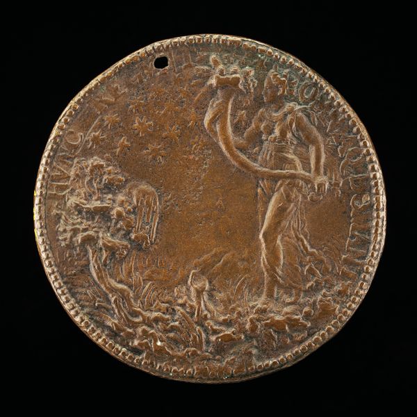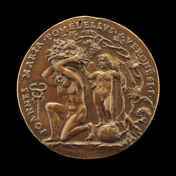 Curator: The bronze relief before us is a medal created by Guillaume Dupré in 1607, entitled "Lion and Fury with Torches [reverse]". Editor: My initial impression is one of constrained energy. The circular format and dense composition suggest pent-up forces about to be unleashed, or perhaps contained. The bronze lends an air of ancient authority to the scene. Curator: I find your reading astute, noting how the circular boundary indeed focuses the narrative. Observe the sinuous, Mannerist style, evident in the exaggerated musculature and dynamic poses. The contrast between the controlled precision of the lion's form and the flowing lines of the fury is key. Editor: Precisely. The Fury with her blazing torches embodies destruction, but what does the Lion signify in this allegory? Given that it's being subdued, is it uncontrolled power or, perhaps, courage itself, being guided or even tamed? Also note the inscription 'INTACTVS • VTRINOVE'. Curator: Intriguing questions! We must unpack the symbolism further. The lion, classically a symbol of strength and royalty, certainly seems docile in this tableau. And 'INTACTVS • VTRINOVE' translates roughly to "Untouched in either way." Might this refer to a resilience or invulnerability despite the chaos suggested by the Fury? Editor: It points towards an assertion of resilience, suggesting fortitude during periods of disruption. I can't help but also consider the gendered dimension – a powerful, feminine Fury directing male potency represented by the lion. The torches, age-old emblems of enlightenment or, in this context, war, complicate the reading, making one ask, to what end is the Fury leading this 'courage?' Is there perhaps a psychological reading one could apply? Curator: An intriguing possibility. From a formal perspective, the relief's texture enhances the drama. The densely packed background provides an almost claustrophobic setting. Note how Dupré employs varying depths in the relief, creating an illusion of space and depth despite the compact dimensions. Editor: It definitely amplifies that sense of compacted intensity we sensed at first viewing. Examining the Fury, what emotions, what cultural memories would the contemporary audience associate with it? The tension between these iconic images is incredible! It’s interesting to speculate. Curator: Absolutely, our analysis of Dupré’s choices in this bronze provides us with greater depth and insight. Thank you for your fascinating perspective. Editor: Likewise, it has been interesting to uncover layers of meaning behind the work together. Thank you.