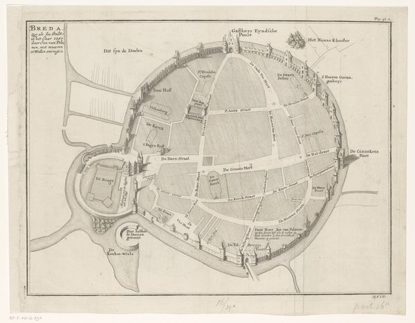 Balthasar Florisz. van Berckenrode made this engraving of the Siege of Breda in 1637 using the technique of etching. The original copperplate would have been coated with a waxy, acid-resistant substance called 'ground.' Then, the artist would have used a sharp needle to scratch away the ground, exposing the metal beneath, and dipped the plate in acid, which bit into the lines. The incised plate would be inked, the surface wiped clean, and then pressed onto paper, transferring the image. This process allowed for relatively quick reproduction, making images like this accessible to a wide audience. The social significance of this map lies in its function as both documentation and propaganda, carefully crafted to portray military events with precision. The making of such images would have involved a division of labor, with specialized artisans contributing to different stages of the process. Ultimately, this print reminds us that even seemingly straightforward images are the result of complex material processes and social contexts.