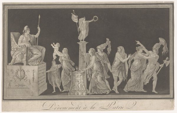 Jean François Janinet created this print, "Tarquinius and His Wife Lucretia Spinning," using etching and aquatint. The scene depicts the moment when Tarquinius discovers his wife Lucretia engaged in the traditionally feminine activity of spinning, contrasting sharply with the idle behavior of other wives. Made in France, this artwork reflects the 18th-century's fascination with classical antiquity, particularly the moral virtues associated with Republican Rome. This narrative likely served as a commentary on the social structures of the time. It promoted ideals of domestic virtue and industriousness among women, reinforcing the importance of traditional gender roles within the family and society. The imagery is deliberately didactic, using the past to instruct viewers on contemporary moral standards. Historical archives, fashion plates, and conduct books of the period are valuable resources for contextualizing Janinet's work. By looking at these sources, we can better understand the social and institutional forces that shaped its production and reception.