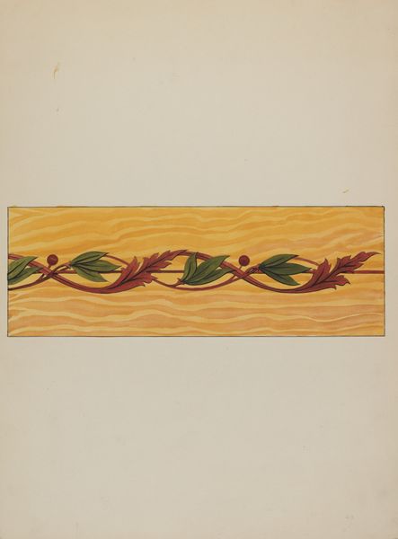 Editor: So, this watercolor piece is called "Painted Glass" by James McLellan, dating from around 1937. It features three vertical panels of stylized foliage against a deep reddish-brown background. It’s quite striking, almost like a design for stained glass. What do you see in it? Curator: I see a fascinating negotiation of art, craft, and social function. McLellan’s choice of foliage as a motif points to several compelling avenues of exploration. Are these plants native to a specific locale? How might their presence within architectural structures alter or affect the space they inhabit? It encourages us to question how he's using images from nature to promote or undermine specific social ideas and hierarchies. Editor: That's interesting. I hadn't considered that the foliage might represent specific ideologies. Curator: Consider also the historical context. 1937 falls squarely within the era of the New Deal. Did McLellan work under the WPA, or Federal Art Project? This informs our understanding. The rendering of the design itself prompts consideration of power dynamics. Is this McLellan's idea of the ideal natural landscape, or is he challenging traditional ways of representing the relationship between nature and humanity? Editor: I see what you mean. The way the panels are isolated might suggest division. Curator: Exactly! The linear and isolated aspect might be challenging certain historical concepts of community that depended on that relation. How do you perceive McLellan’s commentary here? Editor: I’m starting to think it’s less decorative and more about making us think about how we relate to the natural world and to each other. It gives the design an almost unsettling quality. Curator: Precisely. Art isn’t always meant to comfort us; sometimes it’s a call to engage, to critique, and ultimately, to dismantle preconceived notions. I have a lot to ponder regarding decorative art in the pre-war context. Editor: I agree, this makes me want to dive into this time period! Thanks for sharing these insights!