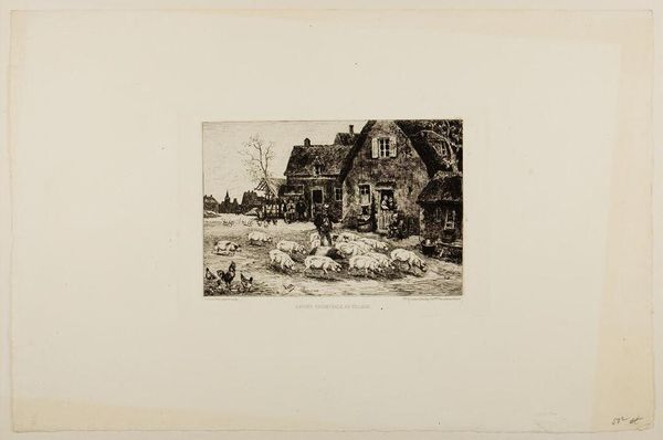 Curator: Look at the composition! The use of perspective draws the eye to the mill itself, a structure that seems almost organic in its placement. Editor: It's a rather idyllic scene, isn't it? This is "First Scene of Maid of the Mill", an anonymous work depicting rural life. Curator: The monochromatic palette enhances the textural contrast—rough-hewn wood against the smoothness of the sky, the dense thatch against the light reflecting off the water. Editor: Absolutely. This print evokes a sense of the everyday, yet it also idealizes the rustic, perhaps reflecting a longing for a simpler past in the burgeoning industrial age. Curator: The arrangement of the buildings and figures creates a dynamic visual rhythm. Note how the angles of the roofs play against the verticality of the trees. Editor: And there's a subtle narrative, isn't there? We are offered a glimpse into the social landscape. The figures suggest a story unfolding. A moment captured in time. Curator: Indeed. The use of light and shadow gives depth to the scene. It almost seems like a stage set. Editor: It's an interesting piece to consider, especially thinking about the romanticizing of rural life at the time. I think there is so much to consider within this composition.