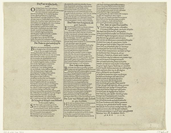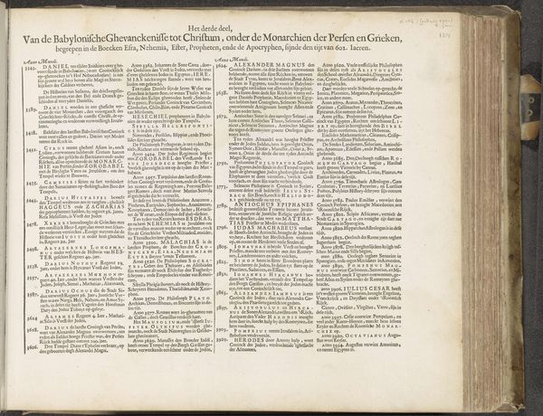 Editor: This is a page from the "Inhoudsopgave voor de Koninglyke Almanach, 1705" printed in 1706 by Carel Allard. It seems to be an index page from a royal almanac, brimming with early modern typography. It feels incredibly dense and layered with its mix of languages and tight justification. What's striking to me is the use of both Dutch and what I believe is French on the same page. How do you interpret this work, given its historical context? Curator: That's a keen observation. As a historian, I see this print as a potent example of the power dynamics embedded within early modern print culture. The use of both Dutch and French isn't just about accessibility; it's about projecting an image of authority and sophistication. Editor: In what way? Curator: French, during this period, was the language of diplomacy and the elite. Its presence alongside Dutch elevates the almanac, suggesting a readership that is both local and internationally aware. Think about who would have been consuming this text, and how its content relates to social power. How does the reference to Louis XIV shape your understanding? Editor: It gives it context! Knowing it was produced in 1706 also highlights its political relevance and perhaps propaganda value during the reign of Louis XIV. The almanac isn’t merely a guide; it's making a statement. What institutions or groups were publishing works such as this at this time? Curator: Powerful institutions like the monarchy, along with wealthy merchants, often commissioned such works. They served to legitimize power, promote ideologies, and cultivate a certain image. The Baroque style further contributes to this sense of grandeur and authority. Editor: I see it! This isn’t just information; it's carefully constructed messaging meant for very particular readers. I didn't appreciate how the intersection of language, typography, and historical context contributed to this propaganda. Curator: Indeed, and considering its production, dissemination, and intended audience gives insight into a bygone era. Hopefully, listeners take from our conversation that understanding art history isn't only visual appreciation but interrogating societal and political conditions.